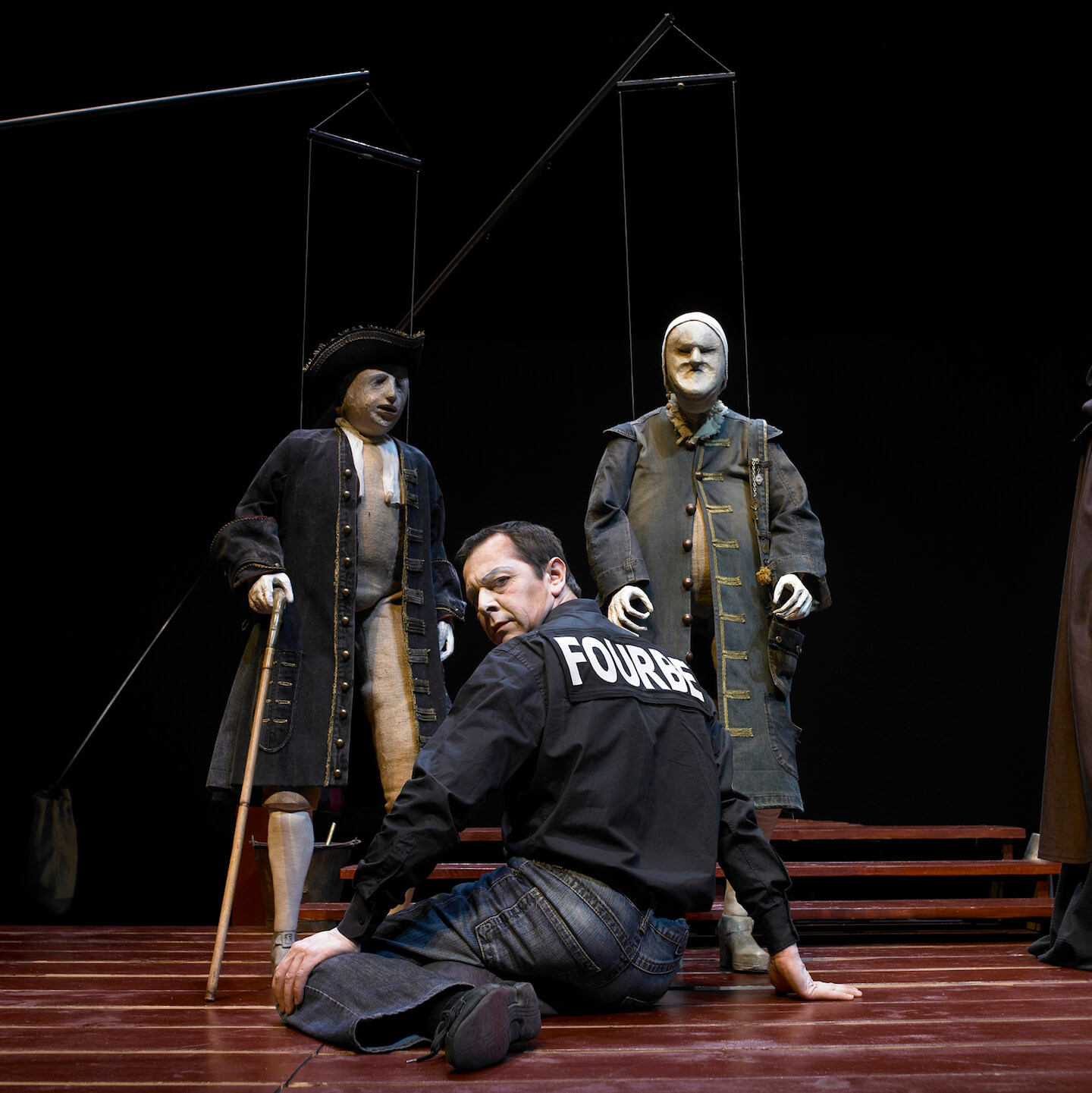Ce spectacle est une véritable performance d’acteur, puisque le comédien-manipulateur Jean Sclavis est seul en scène avec des marionnettes proches de la taille humaine.